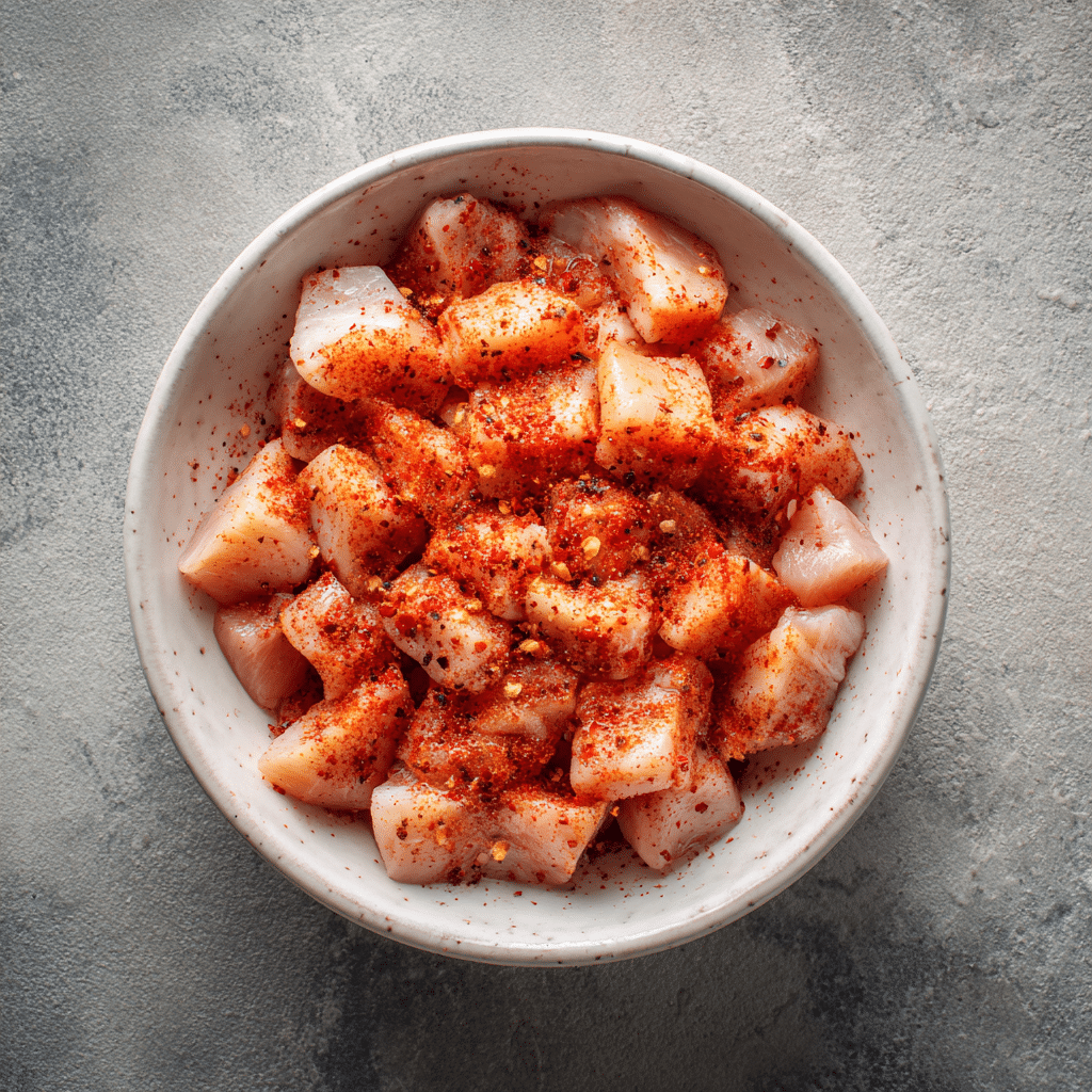 - Toss the diced chicken breast with Cajun seasoning until coated evenly.