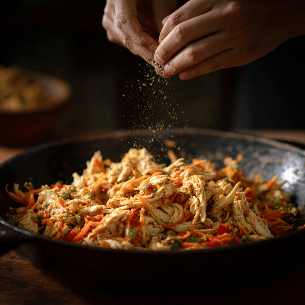 - Add the shredded chicken, smoked paprika, salt, and black pepper. Mix well and cook for another 3 minutes.