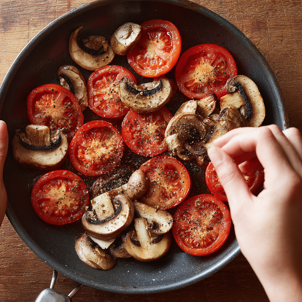 5. Pour off some of the fat if necessary, then add the tomato halves, cut-side down, and mushrooms to the pan. Season lightly with salt and pepper. Cook for 4-5 minutes until the tomatoes are softened and the mushrooms are golden.