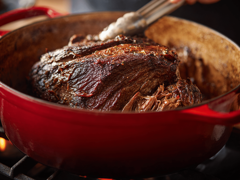 - In a large Dutch oven or heavy pot, heat the olive oil over medium-high heat. Sear the roast on all sides until deeply browned, about 4-5 minutes per side. Remove the roast and set aside.