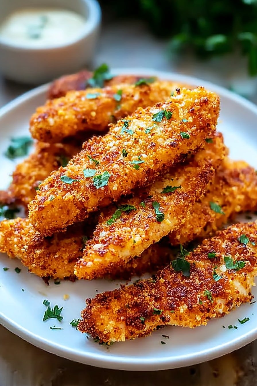 For a classic presentation, arrange the tenders on a platter garnished with additional chopped parsley and thinly sliced green onions, providing both visual appeal and a fresh pop of flavor.