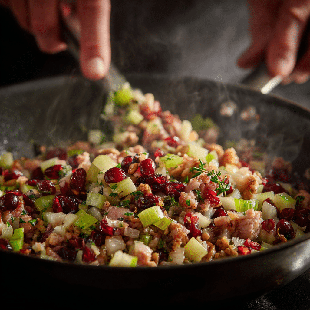 - Stir in dried cranberries (or apricots), walnuts (if using), sage, rosemary, and thyme. Sauté for 1-2 minutes until fragrant.