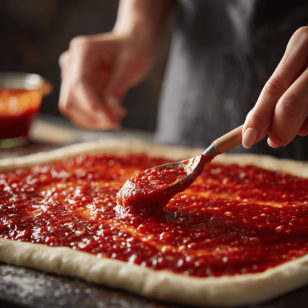3Spread pizza sauce evenly over the dough, leaving a small border along the edges.