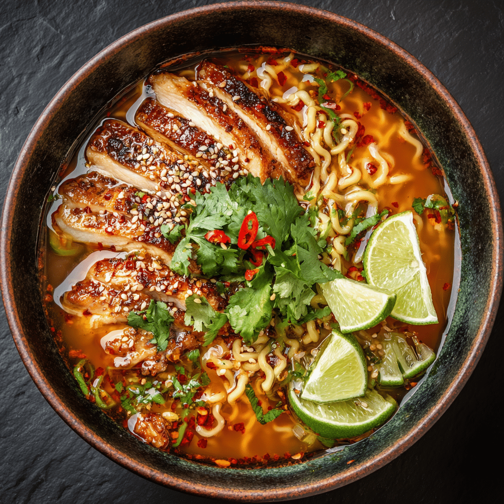 - Garnish with fresh cilantro and a squeeze of lime. Drizzle extra chili oil for more spice if desired. Serve hot and enjoy your Fiery Chicken Ramen with Creamy Garlic Sauce.