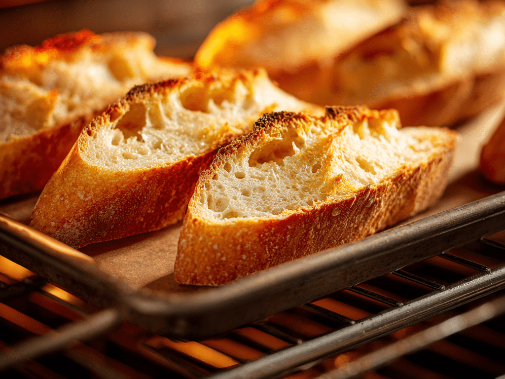 - Just before serving, preheat your broiler. Arrange baguette slices on a baking sheet and toast until lightly crisp, about 2 minutes per side.