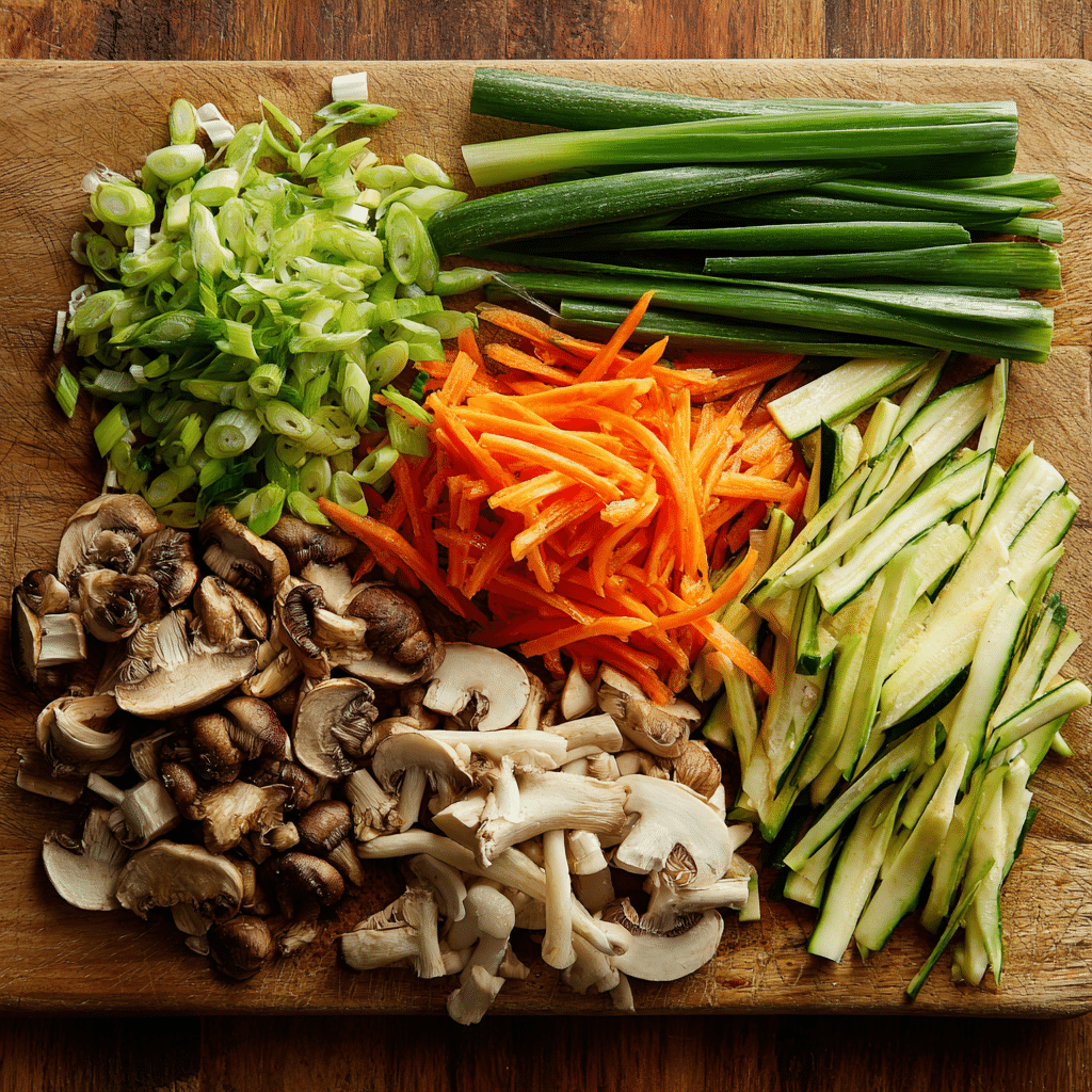 4. Prepare the vegetables by slicing the green onions into 2-inch segments. Julienne the carrot and zucchini, and slice mushrooms thinly.
