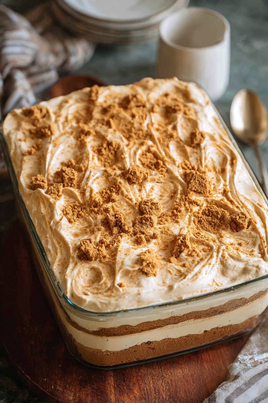 Top each slice with a whole or halved Lotus Biscoff biscuit and a light dusting of powdered sugar. If serving at a festive gathering, consider pairing slices with a scoop of vanilla or caramel ice cream, which further enhances the cake’s caramelized notes.