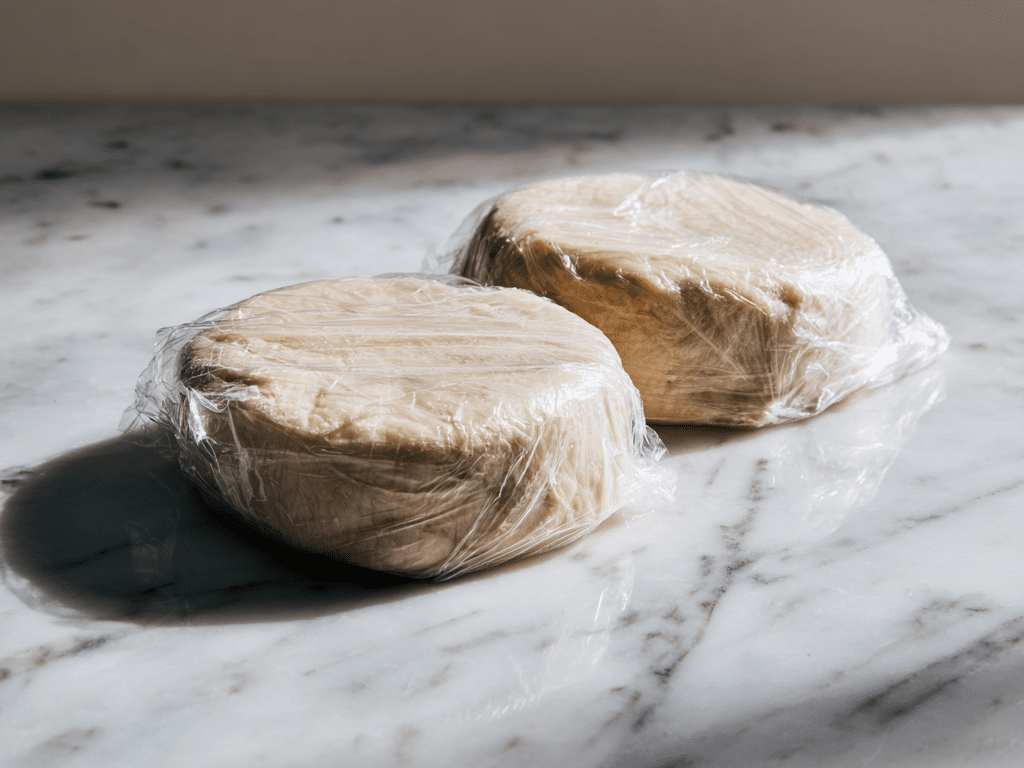- Divide the dough into two equal balls, flatten into discs, wrap in plastic, and chill for 30 minutes.