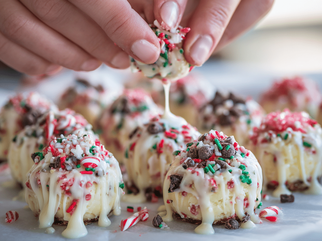- Decorate as desired: Roll chilled cheesecake bites in festive sprinkles, crushed candy canes, or mini chocolate chips. For extra holiday flair, drizzle with melted white chocolate and add colored shredded coconut.