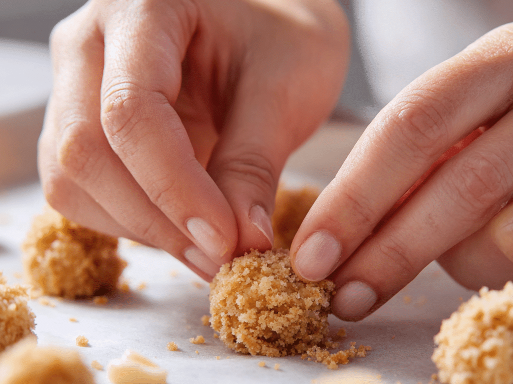 - Line a baking sheet with parchment paper. Scoop about a tablespoon of the crumb mixture into your hand and roll into balls, packing the mixture tightly. If the mixture is too crumbly, add 1-2 teaspoons more melted butter until it holds together. Place on the baking sheet and set aside.