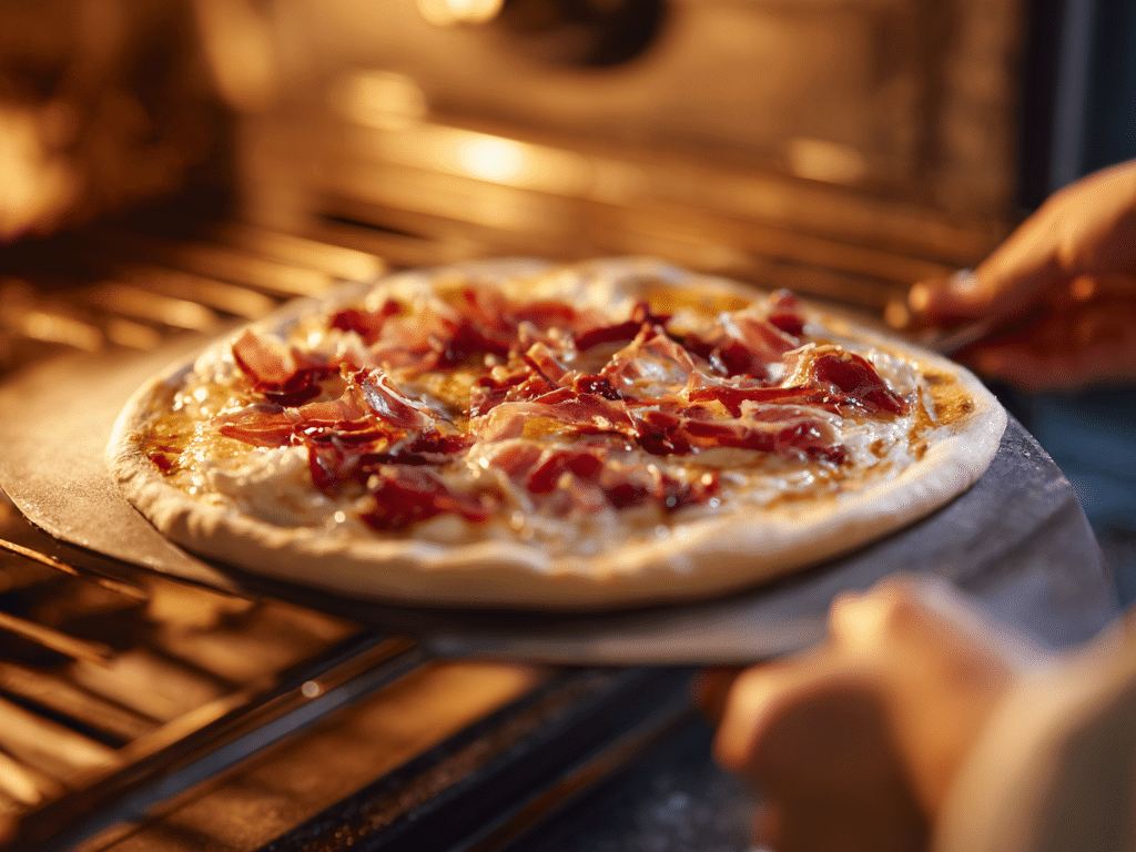 - Carefully transfer the prepared dough onto the preheated pizza stone or baking sheet in the oven.