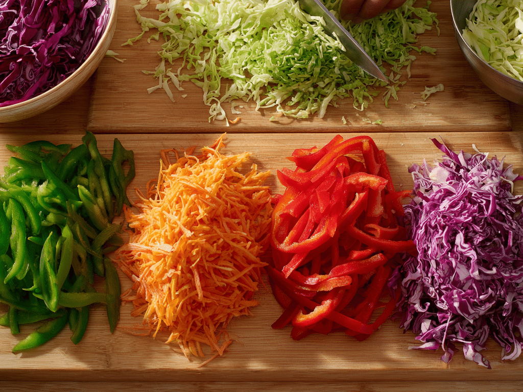 - Prepare the vegetables: Shred the green and red cabbage, julienne the carrot, and thinly slice both bell peppers, red onion, and sugar snap peas. Place all the prepared vegetables into a large mixing bowl.