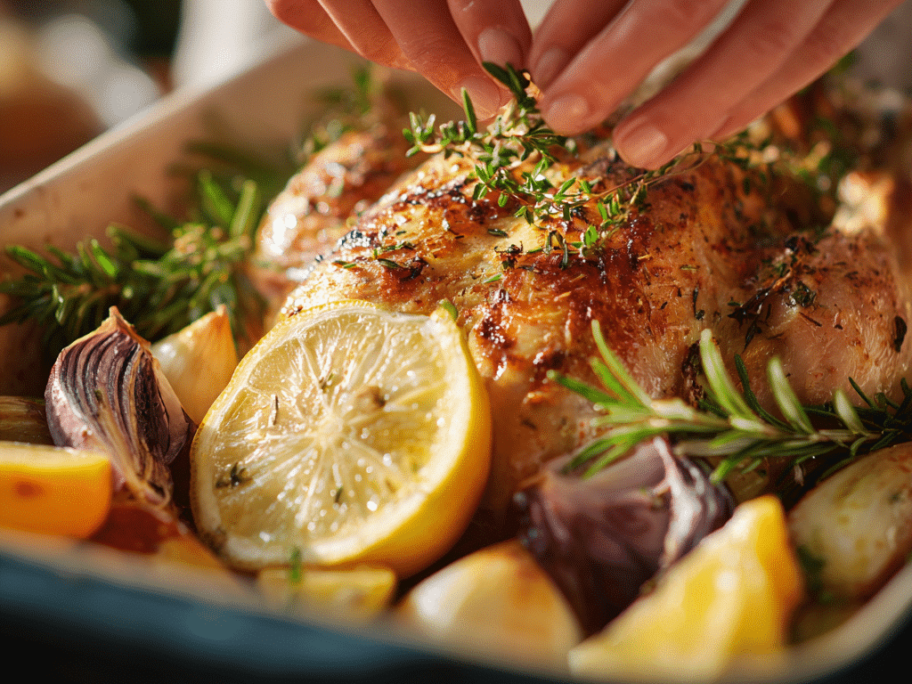 - Stuff the cavity with lemon halves, garlic, thyme, rosemary, and onion quarters.